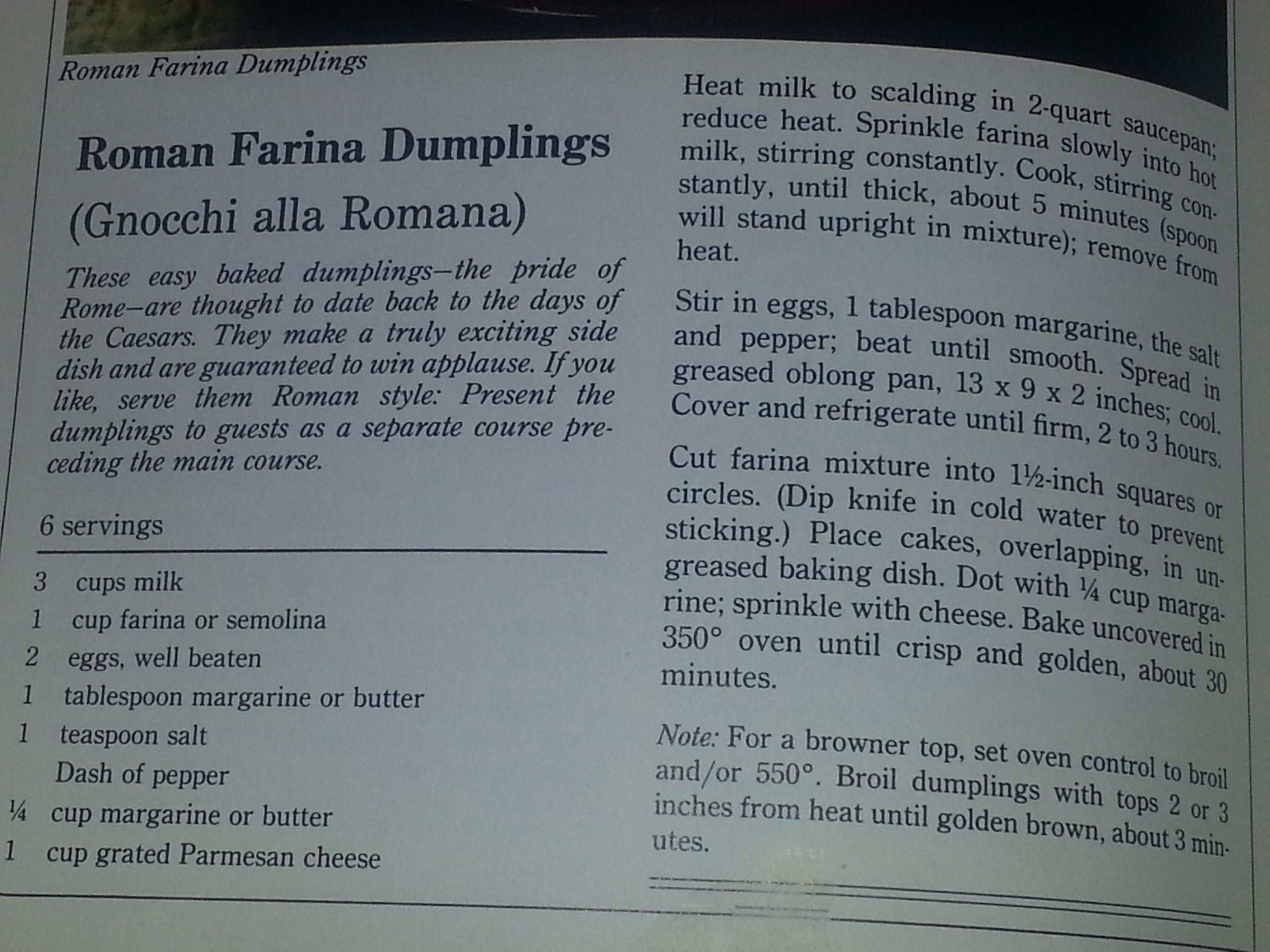 I decided to thank Betty for her cookbook and was rather crestfallen, when I realized that Betty Crocker was a brand name through and through, not one person. Besides the potatoes I had drooled over at my friend’s house turned out to be from a box – Betty Crocker’s Cheesy Scalloped Potatoes. Wonder! why they never tasted the same when I made them? Oh! well at least the recipes are for real. I am making the Farina dumplings again tomorrow, for my son who will be home for the holidays…. so here is the recipe..
